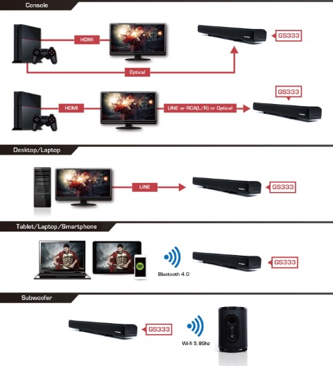 Les deux subwoofers intégrés font du GS333 un véritable système audio tout-en-un, et permettent non seulement d'éliminer le besoin d'un subwoofer externe et de câbles, mais aussi de délivrer un son grave précis et profond, vous offrant ainsi l'immersion la plus totale pour vos jeux et films.