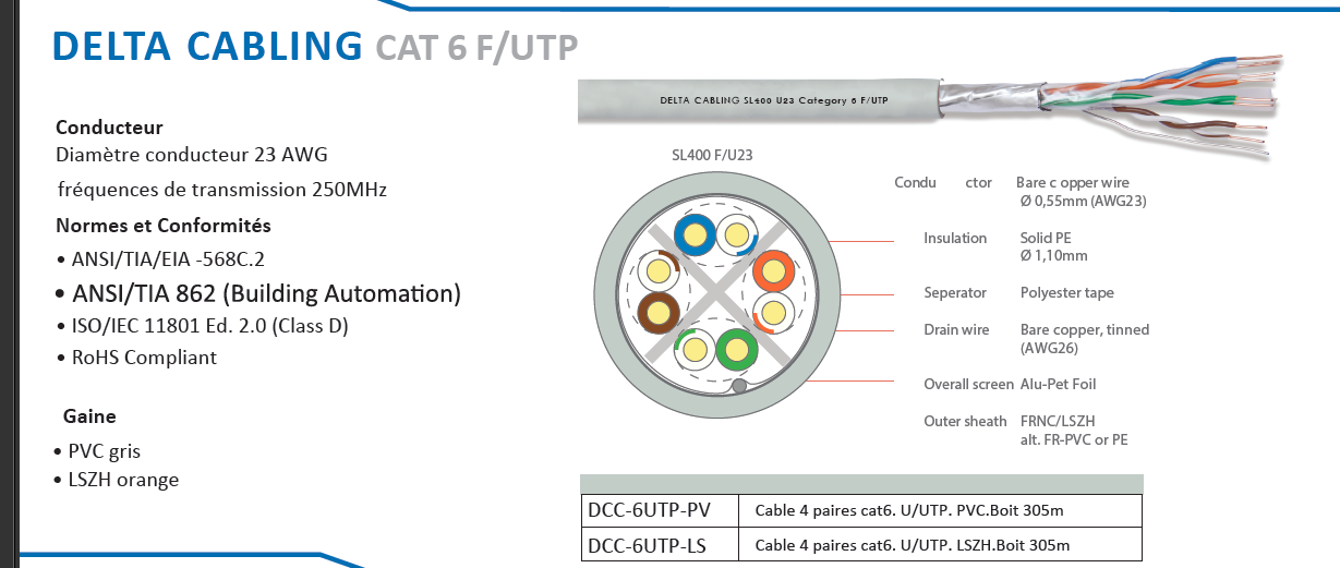 VoIP DCC-A6AUFSL500 - Cable 4 Paires FTP CAT6A LSZH Delta Cabling le metre