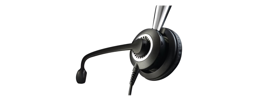 Casque filaire 2 écouteurs en simili-cuir Connexion via cordon QD pour téléphone fixe, PC/Mac mobile et tablette Spécial usage intensif serre-tête rembourré et cordon renforcé en Kevlar Microphone antibruit et Air Shock Technologie Peakstop™ pour éliminer les pics sonores Voix HD Freespin perche flexible rotative à 360° rotor cranté ultra robuste La connexion du casque sur votre téléphone nécessite un cordon QD/RJ9