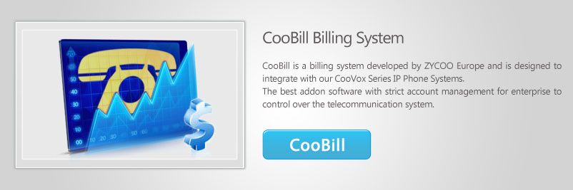 CooBill est un système de facturation développé par Zycoo Europe et est conçu pour intégrer avec les systèmes téléphoniques IP de la série CooVox. Son but principal est d'aider les entreprises dans la gestion de leur processus de gestion des télécommunications, et leur permettre d'accéder à une liste des appels quotidiens de compte rendu détaillé ou pour produire des factures pour les clients. Une fois l'intégration avec les systèmes téléphoniques IP CooVox est complète, CooBill peut être utilisé pour vérifier la facturation pour chaque poste, pour recharger un poste sélectionné, etc. Pré-paiement et post-paiement sont disponibles pour des options flexibles de type de rémunération.