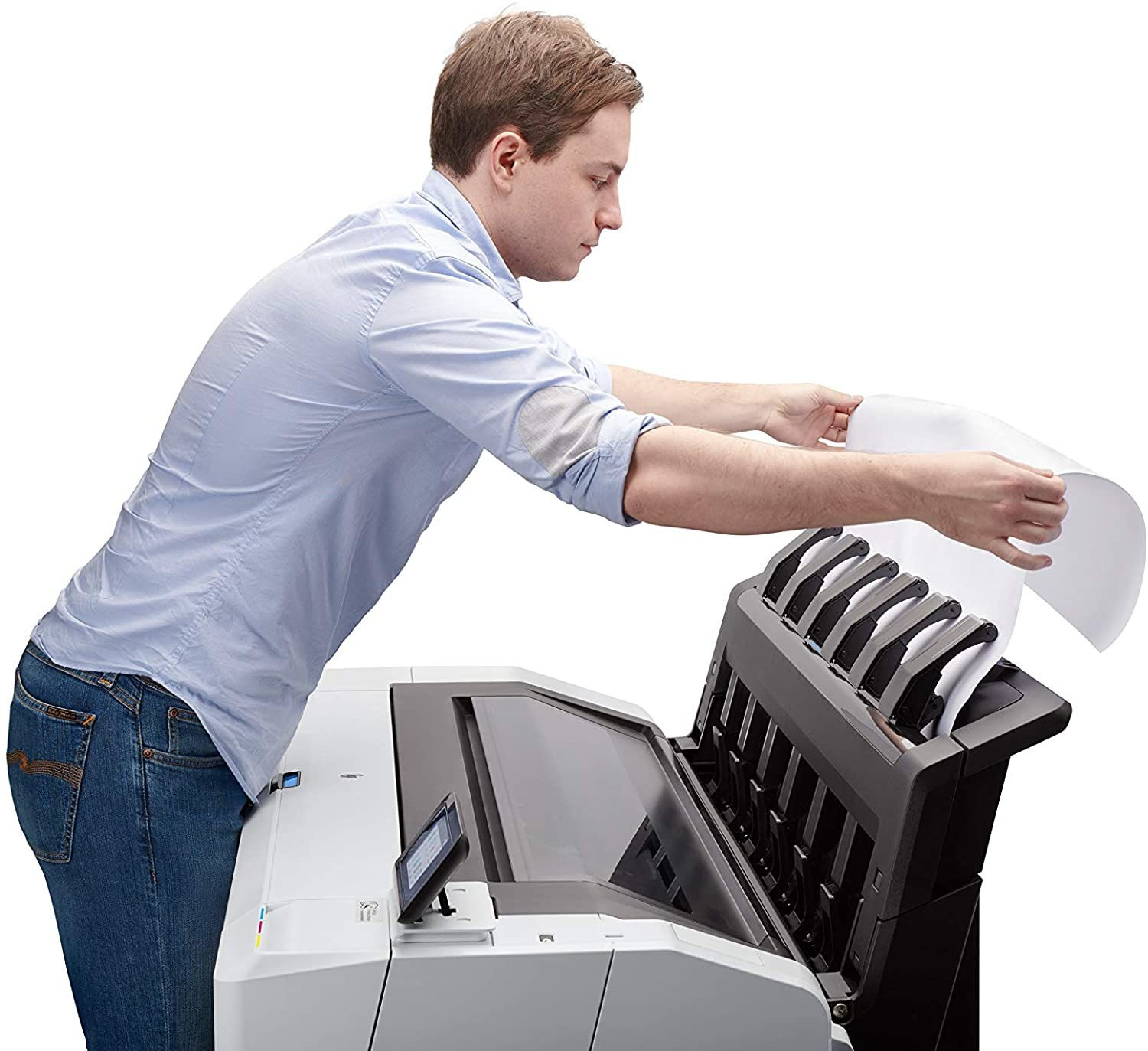 | Alimentation et sortie papier | Alimentation feuille à feuille, rouleaux à chargement automatisé par l'avant, empileur de sortie intégré, bac de réception, massicot horizontal automatique |