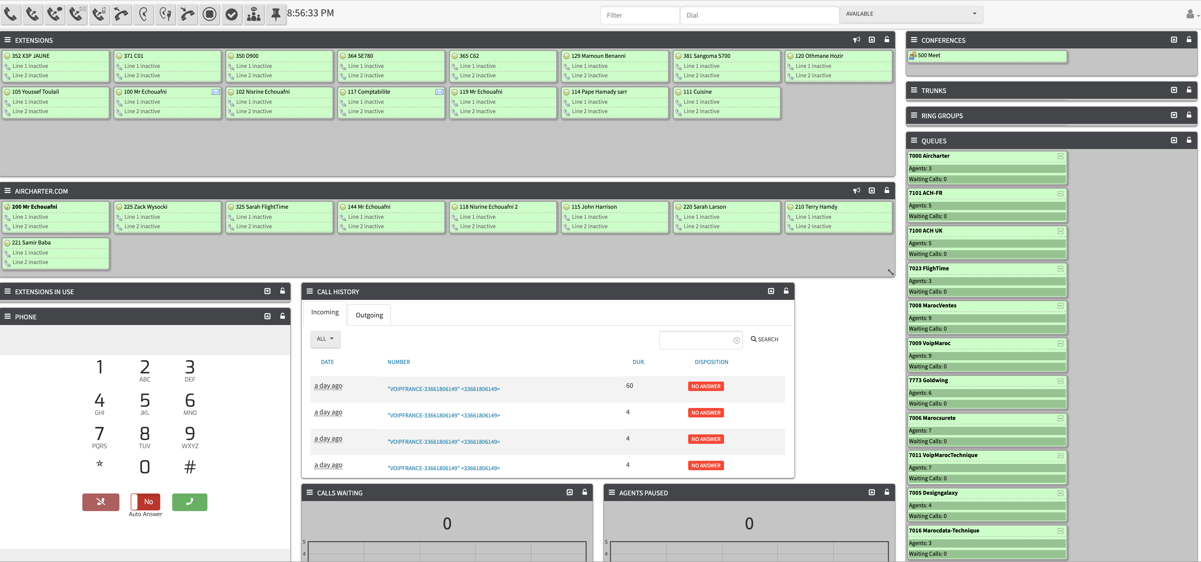 The panel lets you see detailed PBX activity, like who is talking and to whom, call durations, held calls, queued calls, etc. It lets you control your phone and perform transfers, launch call spying and whisper, monitor queue activity and more. All from your web browser, without the need to install anything on the client side. It can show any number of lines per phone and held call status, so you can see exactly what is going on.Features