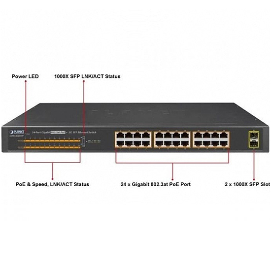- 24 ports 10/100/1000T 802.3at PoE+ ; 2 slots 1000BASE-X SFP/mini-GBIC