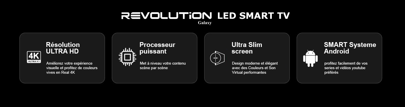 Télévision 85″ Revolution Galaxy 4K Smart Tv + Récepteur intégré + TNT