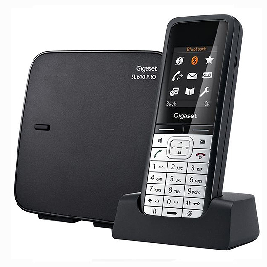 "Gigaset SL610 Pro" Téléphone Dect, écran couleur, connexion casque Bluetooth ou jack 2,5 mm, mains-libres, échanges de données via bluetooth ou mini USB, vibreur, répertoire 500 contacts, accès direct à la ligne sortante grâce à la touche ''off-houk''