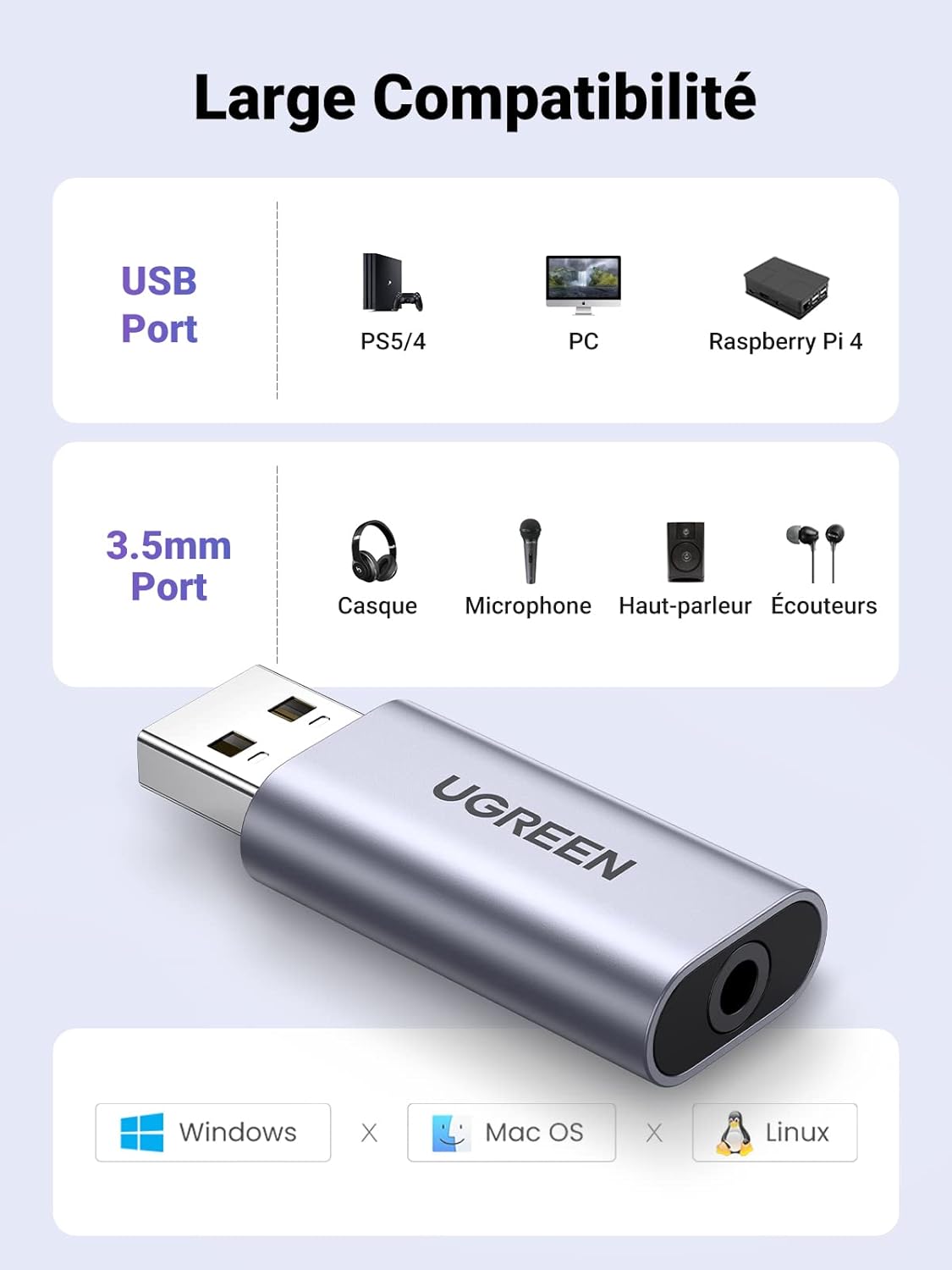 Ugreen 80864 - Adaptateur USB-A vers Port Jack Audio 3,5 mm