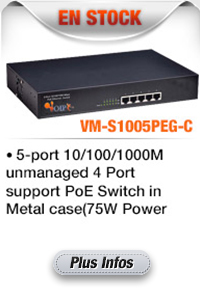 VM-S1005PED 5-port 10/100M Desktop POE Switch provides the seamless network connection. It integrates 100Mbps Fast Ethernet and 10Mbps Ethernet network capabilities. These POE ports can automatically detect and supply power with those IEEE 802.3at compliant Powered Devices (PDs).