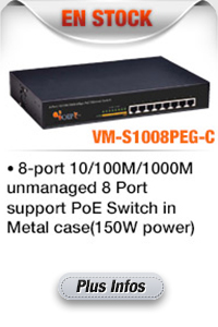 VM-S1008PEG 8 ports 10/100 / 1000M bureau commutateur PoE fournit la connexion réseau sans coupure. Il intègre 100Mbps Fast Ethernet et des capacités de réseau Ethernet 10Mbps.Ne pas utiliser sur plus de 4 caméras.