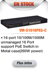 VM-S1016PEG-C-16port 10/100 / 1000M Switch PoE fournit la connexion réseau sans coupure. Il intègre 10/100 / 1000Mbps Ethernet capacités de réseau. Ces ports POE peut automatiquement,détecter et fournir de l'énergie à ces IEEE 802.3at conformes appareils alimentés (PDS).Ne pas utiliser sur plus de 8 caméras.