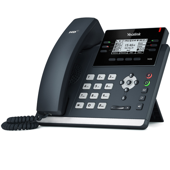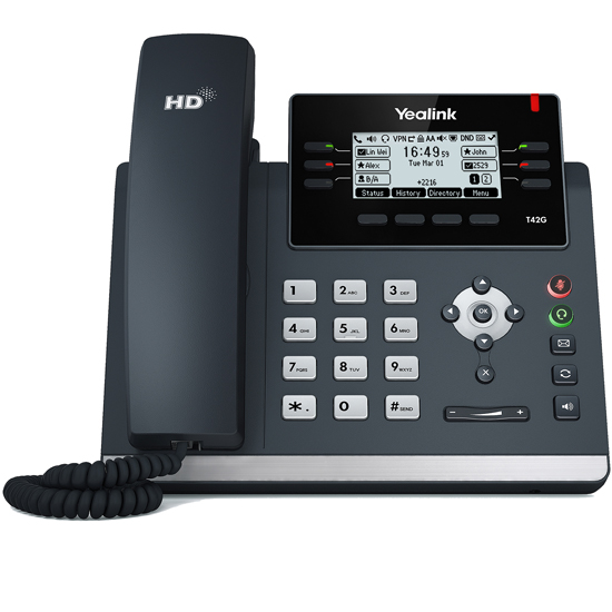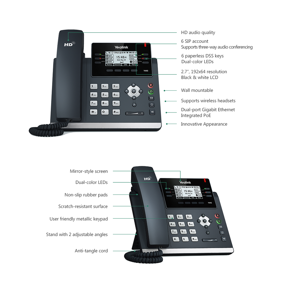 Le Yealink T42G est un téléphone VoIP professionnel conçu avec des fonctionnalités pour compléter un environnement d'affaires. La conception du SIP-T42G comporte des boutons encastrés ergonomiques, un support réglable avec pieds en caoutchouc antidérapant et une conception sans étiquette en papier. Les technologies avancées de clarté acoustique telles que le duplex intégral, l'annulation d'écho et le tampon de gigue adaptative créent une expérience audio améliorée.