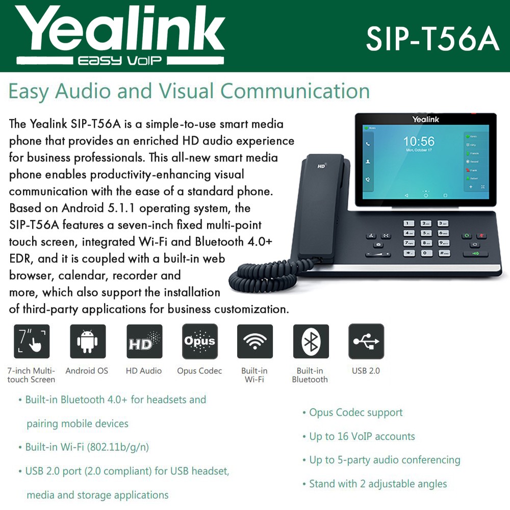 Téléphone 16 comptes SIP écran tactile caméra Bluetooth WiFi Android